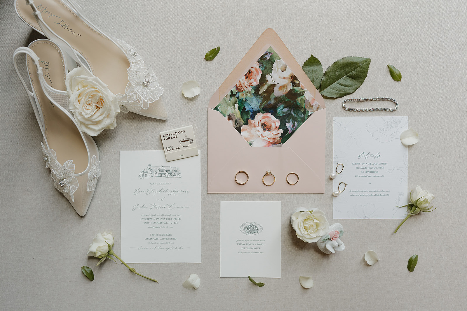 This June wedding is, in the bride's words, "nature adjacent," at the Cincinnati Nature Center. We wanted to convey a subtle nod to florals centered in the couple's pink and green colors. Loving the drama the bold envelope liner brings to the refined invitation suite.